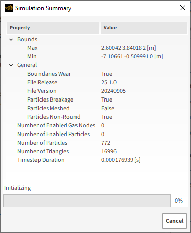 微粒 形状 Polyhedron⯆ Particle | Size Add row (x2) (1) Size | Cumulative % 0.3 [m] @ 100 [%] (2) Size | Cumulative % 0.2 [m] @ 30 [%] (3) Size | Cumulative % 0.15 [m] @ 10 [%] … | Shape Horizontal Aspect Ration 1 [-] Number of Corners 15 [-] … | Breakage Enable Breakage (已启用) 模型 Ab-T10⯆ Reference Minimum Specific Energy 1 [J/kg] Selection Function Coefficient 0.001 [kg/J … | Breakage | Fragments Minimum Absolute Size 0.05 [m]