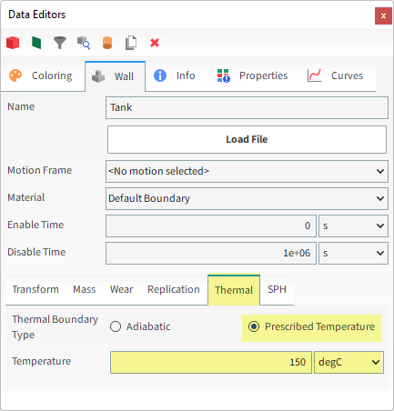 从Data Editors面板中,选择Wall选项卡,然后在Thermal子选项卡中定义Thermal Boundary Type与Temperature(以及unit)。