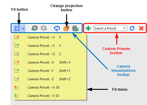 在本教程中,我们将使用Fit菜单(如黄色部分所示)和鼠标来更改3D View,然后使用Custom Preset工具栏(如红色部分所示)保存我们的视图,以便后续重复使用。