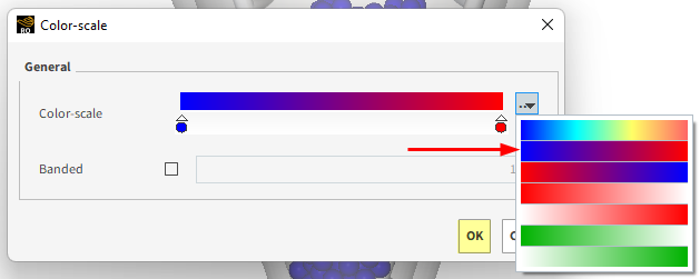 在出现的Color-scale对话框中,可以选择一个预定义的色阶,或者通过移动和/或更改点的颜色来创建自定义色阶。对于本教程,单击…按钮并选择蓝到红的色阶(如图所示),然后单击OK。