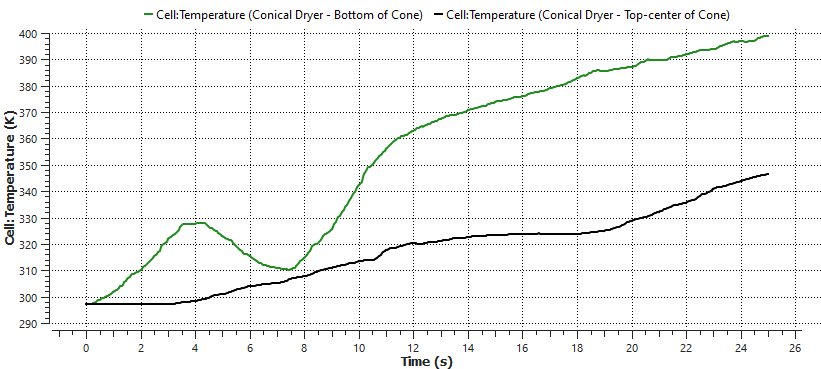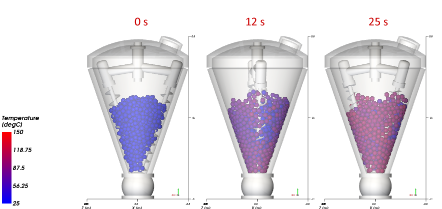 直到4秒之前,位于锥体底部的颗粒因与壁面接触而被加热。之后,由于与温度较低的相邻颗粒之间的传导,它有一些热损耗,直到它在大约7秒时开始再次受热。
