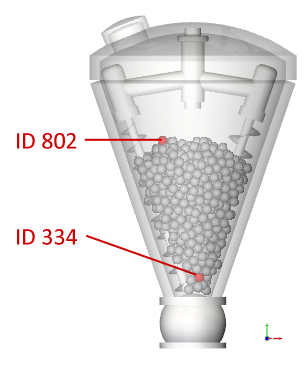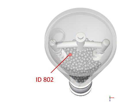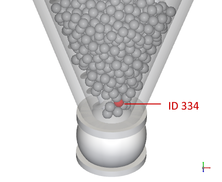 对于本教程,我们将在运动开始时定位两个颗粒,然后追踪它们随时间变化的温度:一个颗粒位于锥体的顶部中央,另一个位于底部。(请注意,您的颗粒的实际ID可能略有不同。)