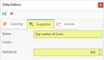从Inspector选项卡中,更改Name(如图所示),然后在Particle ID列表框中使用箭头(或键入数字),以显示单个颗粒在3D View中的位置,直到您找到位于锥体顶部的颗粒(在本教程中是ID 802)。