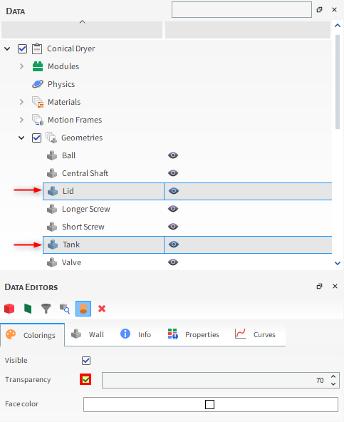 针对这两个窗口,将颗粒的颜色设置为灰色,然后将Lid和Tank几何结构设置为透明。