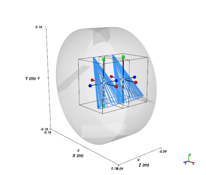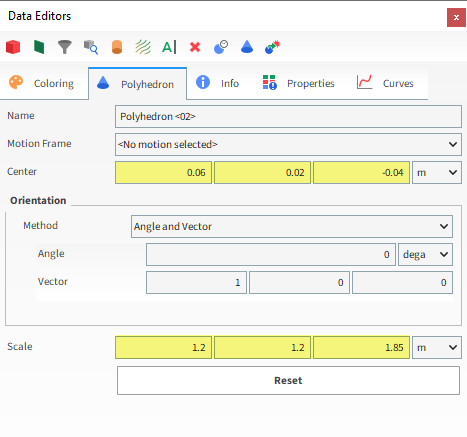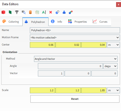 要可视化新创建的颗粒,单击View按钮。出现了一个新的Particles Details窗口,显示了(透明)颗粒几何结构、其几何中心(黄点)和质心(蓝点)。