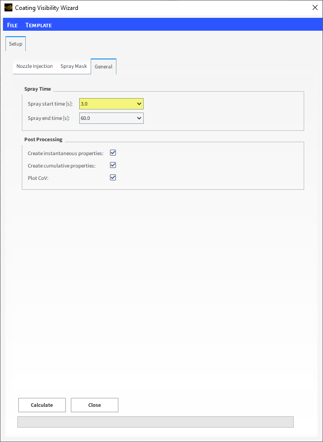 在General子选项卡上,您可以定义Spray Time和Post Processing的选项。