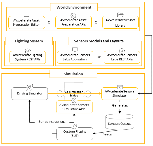 Ansys AVxcelerate Sensors Simulator is a key component of a comprehensive solution for ADAS closed loop simulation. More specifically, it represents the calculation core of the solution and is responsible for physics-based sensor simulation. In order to operate, Ansys AVxcelerate Sensors Simulator communicates with different software and resources.