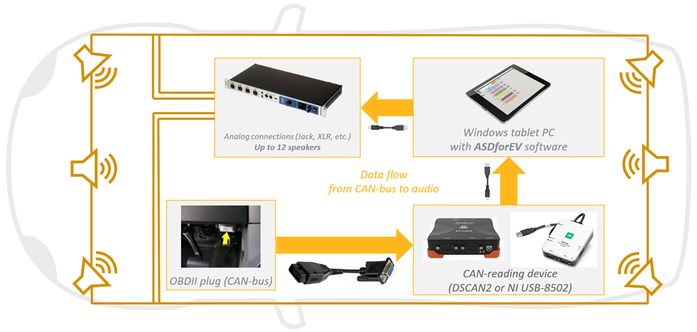 As an acoustic demonstrator in real driving conditions, ASDforEV helps manufacturers and sound designers to create several types of sounds, such as AVAS (Acoustic Vehicle Alerting System) sounds which are now mandatory for silent vehicles to warn pedestrians.