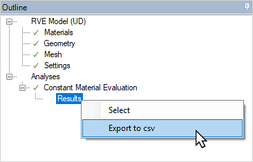 Contents Chapter 2: Material Designer Features | 2.9. Data Management | Print page 2.9.4. Export to CSVUse the Context Menu of the Results entries in the Outline to export the computed material data to a .CSV file. « 2.9.3. Clear Generated Data 2.9.5. Export to h5 »