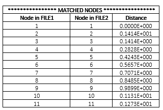 | Resulting matched / mapped nodes | *** NOTE *** Node matching in RSTMAC command succeeded. 31 pairs of nodes are within the tolerance (.005). | *** NOTE *** Node matching in RSTMAC command succeeded. 61 pairs of nodes are within the tolerance (.02). | *** NOTE *** Node mapping in RSTMAC command succeeded. 61 nodes are mapped. | |