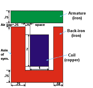 The magnetic flux produced by the coil current is assumed to be so small that no saturation of the iron occurs, allowing a single-iteration linear analysis. The flux leakage out of the iron at the perimeter of the model is assumed to be negligible. This assumption is made simple to keep the model small. The model would normally be created with a layer of air surrounding the iron equal to or greater than the maximum radius of the iron.