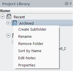 The Project Library will list the recent projects in the Recent folder as ordered by date of access. Additionally, separate folders (virtual folders) can be created and used to store projects. These new folders affect only the layout of the project library to help organization. They are not created on the disk, and projects inside them are not relocated in the disk.