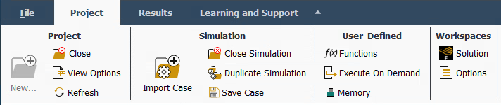 Project → or File → opens a preexisting Fluent Icing project. A window appears allowing you to navigate to and select a preexisting project file (projectname.flprj). All simulations contained within the project will be displayed in the left-side Project View.