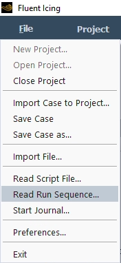Many of the commands and settings present in the Fluent Icing panels can be recorded using python commands from the → menu. These journal files can also be executed through the → menu.