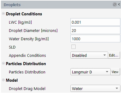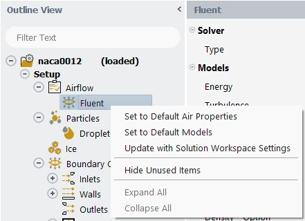 The parameters shown below Fluid are the Fluent parameters and only appear when Fluid is set to . For icing simulations, you should set Density - Option to and the remaining properties using Recommended Settings. Alternatively, this could be done by right-clicking Fluent under Setup → Airflow in the Outline View and then by selecting .