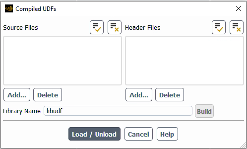 The UDF library name is specified in the Library Name field. The library will be automatically created in the simulation folder. The button is used to build the UDF Library.