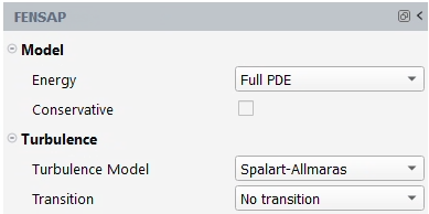 Full PDE, Constant enthalpy and Energy only. Full PDE is the most common option for icing applications. By default, FENSAP solves the energy equation in non-conservative form which results in robust convergence especially when the momentum and energy systems are uncoupled. To solve the energy equation in conservative form, enable Conservative. The conservative formulation improves heat flux accuracy for transonic speeds and above, but may require a lower CFL number to converge.