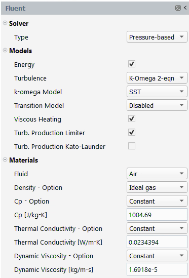 If using air material properties, they should be set based on the free stream or reference static temperature of the case. To do this, you can use the command explained below. For more information regarding recommendations on how to set-up air properties and physical models in Fluent, consult Recommended Settings.