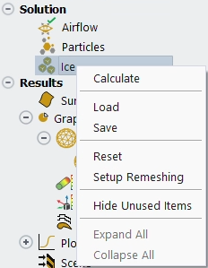 Note: All post-processing performed using the options available in Outline View → Results, or in the top ribbon, Results → Quick-View, are performed using the solutions currently loaded in memory. The command in the Project View loads the Post-Analysis feature and allows to load file sequences and to combine complex scenes with multiple datasets, see Post-Analysis (Beta) in Fluent Icing. Alternately all solution files can be post processed using Viewmerical, CFD-Post or EnSight by right-clicking the file in Project View and selecting the appropriate option, as described in Using the Project View to Interact with Fluent Icing Simulations.