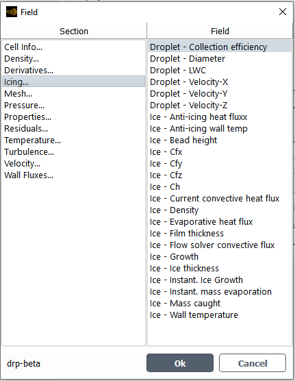 Displays contours of solution fields over surfaces. The results of Fluent Icing are listed in the Icing variable category. The list of available Fluent Icing fields will depend on the solution files currently loaded (airflow, droplets, crystals, vapor, ice). All Fluent Icing fields are solutions defined at the nodes.