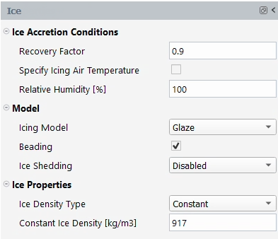 The most common airflow properties of FENSAP for icing simulations are the ideal gas properties with constant thermal conductivity and dynamic viscosity as specified in the Recommended Settings.