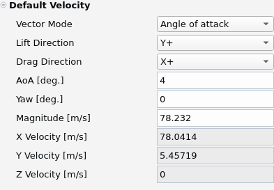 The direction of the flow is specified via two angles, AoA [deg.] and Yaw [deg.] and its velocity magnitude by Velocity magnitude [m/s]. The planes on which these two angles are defined are obtained by selecting the coordinate axis of lift (Lift Direction) and drag (Drag Direction) for a zero degree AoA. The AoA is defined on the plane consisting of the Drag Direction as the primary axis and the Lift Direction as the secondary axis, while the Yaw angle is defined on the plane consisting of the Drag Direction as the primary axis and the result of the cross product of Drag Direction x Lift Direction as the secondary axis.