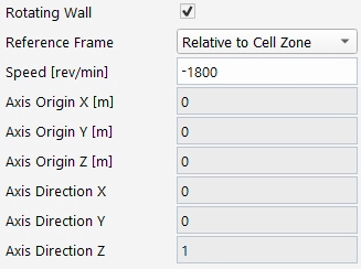 For simulations with rotating components like propellers and engine rotors, the Reference Frame should be set to . This will activate the rotational frame formulation for the equations of motion in all solvers, applying a rotation vector defined as revolutions per minute (rpm) along the axis specified in this panel. If there are static walls in the domain (shrouds, splitters, etc.), they will have to be given the opposite rotation speed in their respective boundary condition section.