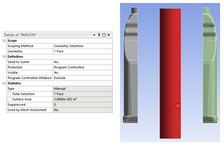 Select the tube of the parison, right-click the selected face and select Create Named Selection..., assigning the name of PARISON.