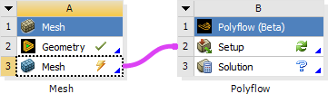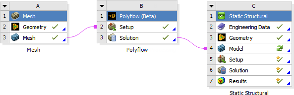 Figure 35.1: Configuring the Polyflow System with a Mesh and a Results System and a Static Structural System