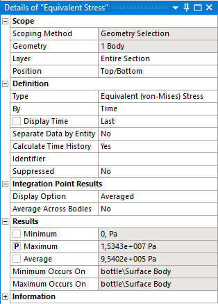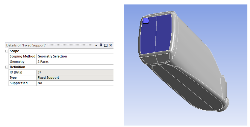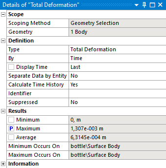 In the Outline View, right-click Static Structural, choose Insert > Fixed Support and select the two faces at the bottom of the bottle geometry.