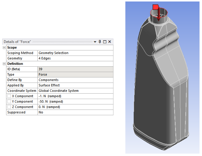 In the Outline View, right-click Static Structural, choose Insert > Force and select the four edges at the top of the bottle geometry.