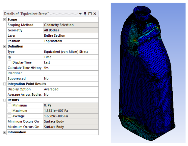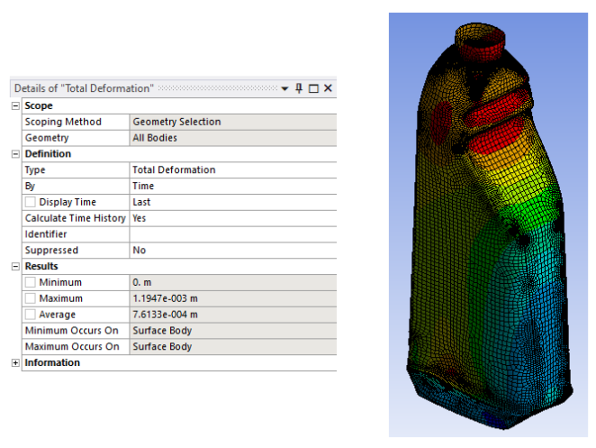 When all calculations are complete, you can see when comparing DP0 and DP1 in the Table of Design Points that Total Deformation Maximum and Equivalent Stress Maximum are a bit higher with a slightly smaller element size. This element size is therefore kept for other design points. You can also observer that the Total Deformation Maximum is below 1mm for an initial thickness of 1.25 mm, the maximum Equivalent Stress is 1.23E7 Pa for this parison.