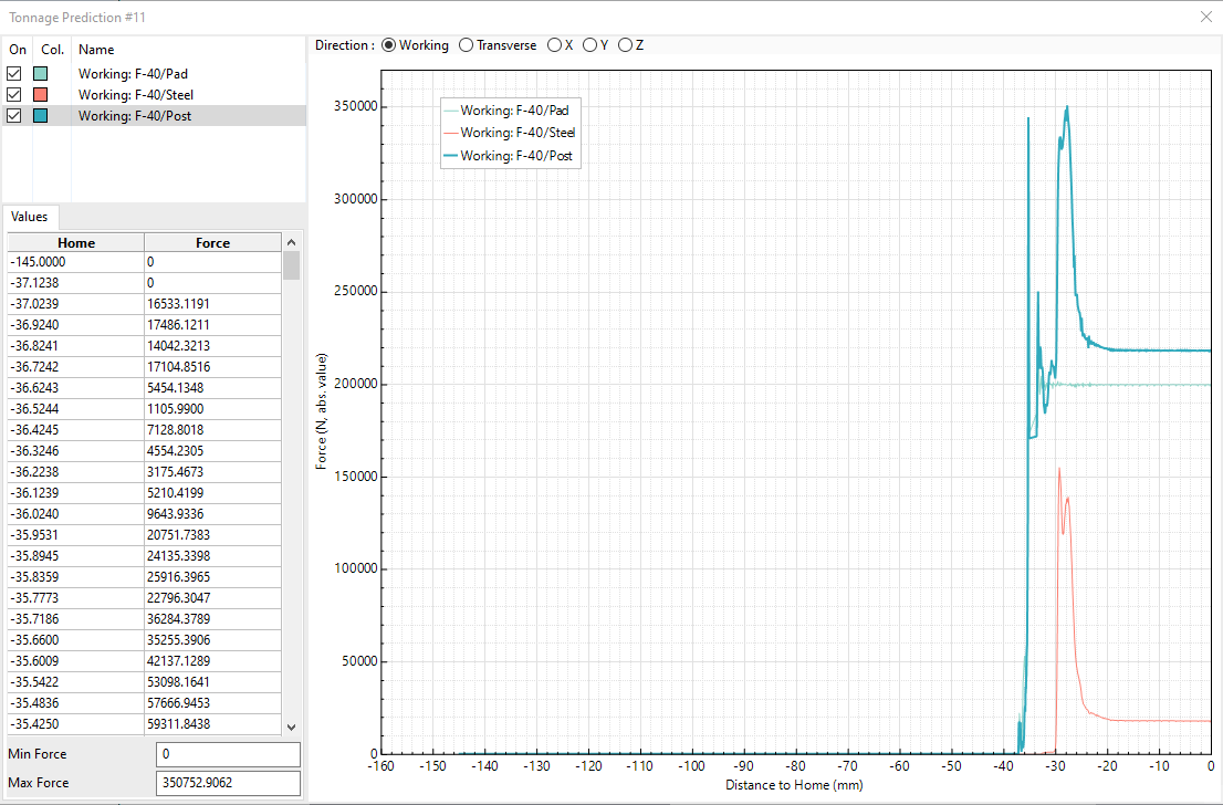 Radio buttons above the plot enable you to choose the direction over which force will be displayed. Choose from Working, Transverse, X, Y, and Z. Choose a direction to display the force predictions in that direction only.