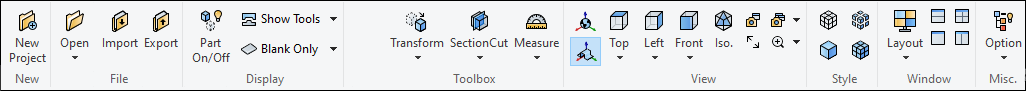 This option is only available once a project is open, and is only really useful when defining operations in the Operations Tab and when viewing results in the Analysis Tab. It enables you to toggle display of process tooling in the graphics window. You can display tooling with a complete or simplified tree by choosing options from the drop-down menu.