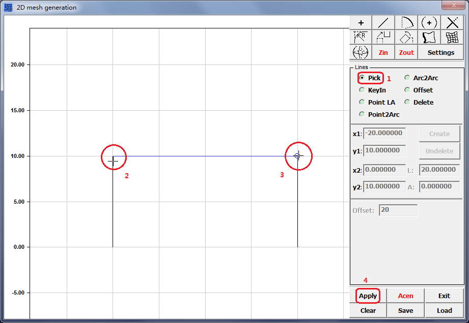Contents Part II: Mesh Tutorials | Chapter 1: Introduction to the 2Dmesh Sketchboard | Print page 1.3. Create Horizontal LineSelect Pick.Click the top end of one line (small circle will appear at the end of the line when the cursor is close enough).Click the top end of the other line.Click Apply. « 1.2. Offset Line 1.4. Create Node »