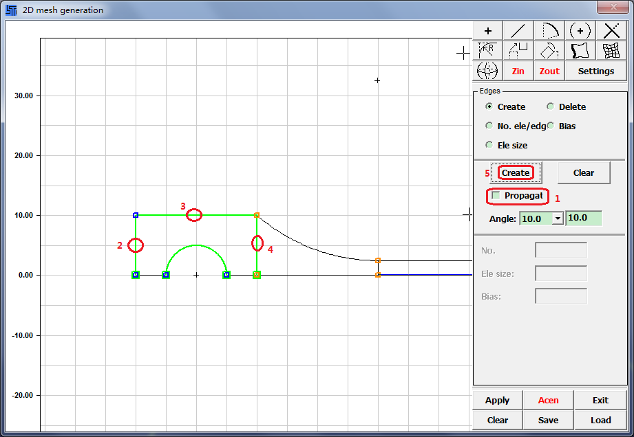Contents Part II: Mesh Tutorials | Chapter 1: Introduction to the 2Dmesh Sketchboard | Print page 1.12. Create Second Edge for Left AreaDeactivate Propagate.Pick the three lines opposite the arc.Click Create. « 1.11. Create First Edge for Left Area 1.13. Create Remaining Edges for Left Area »
