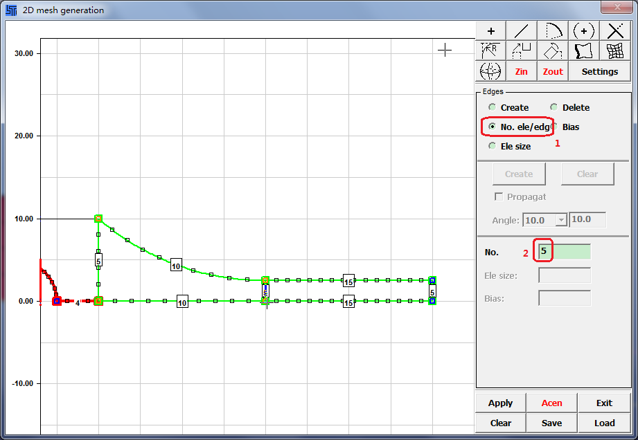 Contents Part II: Mesh Tutorials | Chapter 1: Introduction to the 2Dmesh Sketchboard | Print page 1.17. Assign Number of Elements for Middle and Right Area EdgesSelect No. ele/edge.Enter No. = 5.Click the three vertical edges.Enter No. = 10.Click the two center area horizontal edges.Enter No. = 15.Click the two right area horizontal edges. « 1.16. Create Edges for Middle and Right Areas 1.18. Define Biasing for Selected Edges »