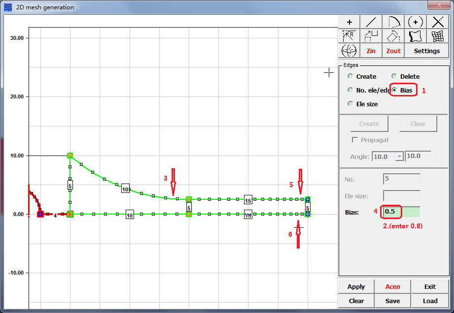 Contents Part II: Mesh Tutorials | Chapter 1: Introduction to the 2Dmesh Sketchboard | Print page 1.18. Define Biasing for Selected EdgesSelect Bias.Enter Bias = 0.8.Click the right end of the arc (the element on the right side of the arc will be 0.8 times the element on the left side).Enter Bias = 0.5.Click the right end of the two horizontal lines for the right area. « 1.17. Assign Number of Elements for Middle and Right Area Edges 1.19. Mesh Middle and Right Areas »