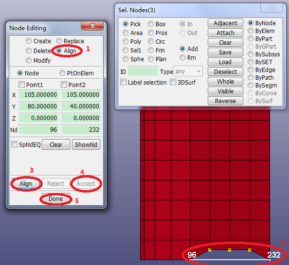 Contents Part II: Mesh Tutorials | Chapter 2: Introduction to Element Editing | Print page 2.6. Align NodesClick Front render button.Click FEM > Element Tools > Node Editing.Select Align in the Node Editing Interface.Pick the nodes (96 > 232 > 229 > 230 > 231) on the model.Click Align.Click Accept.Click Done. « 2.5. Replace Nodes 2.7. Split Elements »