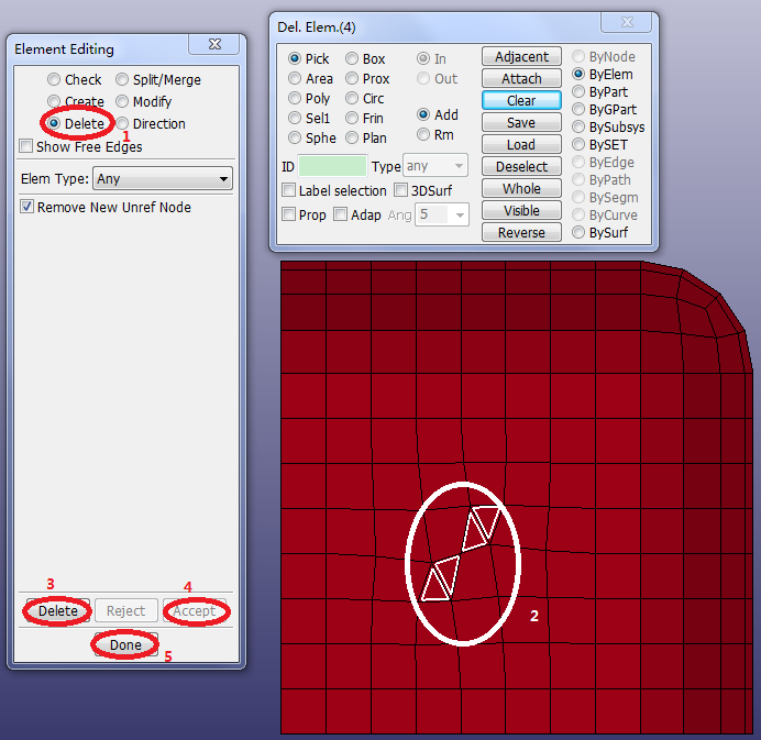 Contents Part II: Mesh Tutorials | Chapter 2: Introduction to Element Editing | Print page 2.8. Delete ElementsSelect Delete in the Element column of the Element Editing Interface.Click the 4 tria elements (Item 2).Click Delete.Click Accept.Click Done. « 2.7. Split Elements 2.9. Create Elements »