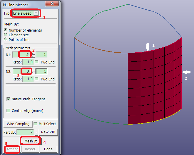 Contents Part II: Mesh Tutorials | Chapter 3: Introduction to Curves and Surfaces | Print page 3.2. Create Line Sweep MeshChoose FEM > Element and Mesh > N-Line Mesher from the menus.Select Type: Line Sweep, then click line 1 and line 2 in graphics window.Enter N1 = 5.Enter N2 = 8.Click Mesh It.Click Accept. « 3.1. Import Geometry Data 3.3. Create 2 Line Mesh »