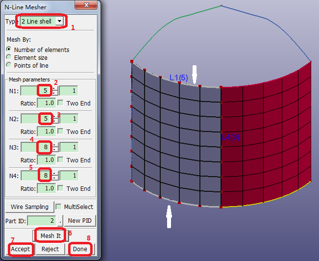 Contents Part II: Mesh Tutorials | Chapter 3: Introduction to Curves and Surfaces | Print page 3.3. Create 2 Line MeshSelect Type: 2 Line Shell, then click the indicated lines in graphics window.Enter N1 = 5.Enter N2 = 5.Enter N3 = 8.Enter N4 = 8.Click Mesh It.Click Accept.Click Done. « 3.2. Create Line Sweep Mesh 3.4. Create Surface »