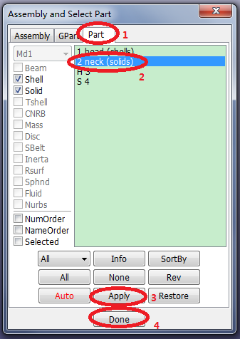 Contents Part II: Mesh Tutorials | Chapter 4: Introduction to the ElGen Interface | Print page 4.4. Turn off Head ElementsClick FEM > Model and Part > Assembly and Select Part.Select 2 neck (solids) only from the list. « 4.3. Generate Shell Elements from Solid Faces 4.5. Generate Shell Elements from Solid Surface »