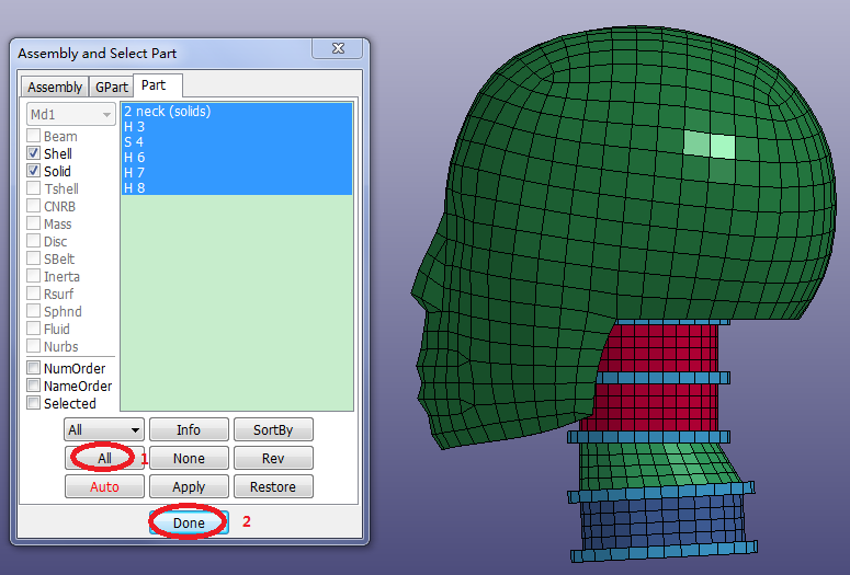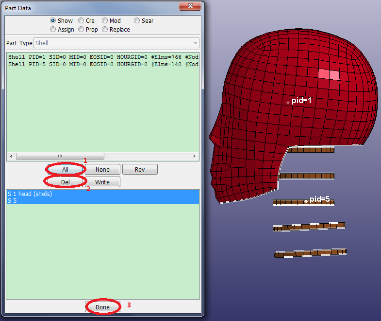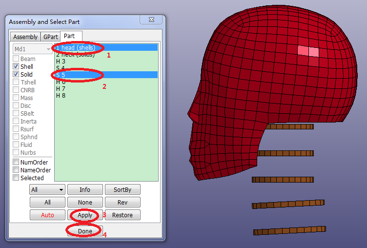 Contents Part II: Mesh Tutorials | Chapter 4: Introduction to the ElGen Interface | Print page 4.10. Clean up the ModelClick FEM > Model and Part > Assembly and Select Part.Select 1 head (shells) and S 5 from the list.Click Right render button.Click FEM > Model and Part > Part Data.Click All.Click Del.Click FEM > Model and Part > Assembly and Select Part.Click All. « 4.9. Generate Solid Elements by Shell Offset Chapter 5: Introduction to Block Mesher »
