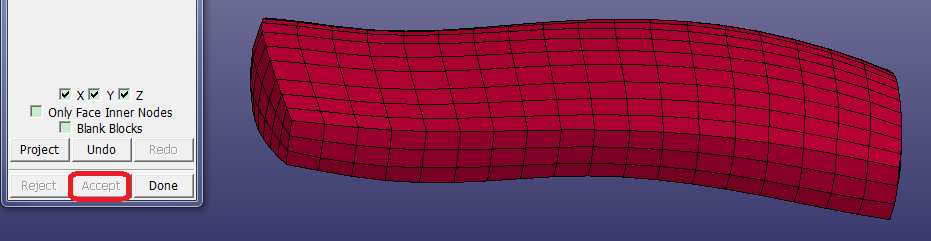 Contents Part II: Mesh Tutorials | Chapter 5: Introduction to Block Mesher | Print page 5.5. Accept the MeshClick Accept.Click EdgGeo render button. « 5.4. Project Surfaces Chapter 6: NURBS Element Creation and Refinement for Isogeometric Analysis »