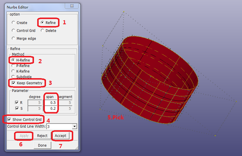 Pick a NURBS element and set new parameter in the text field span in R-direction and S-direction respectively.