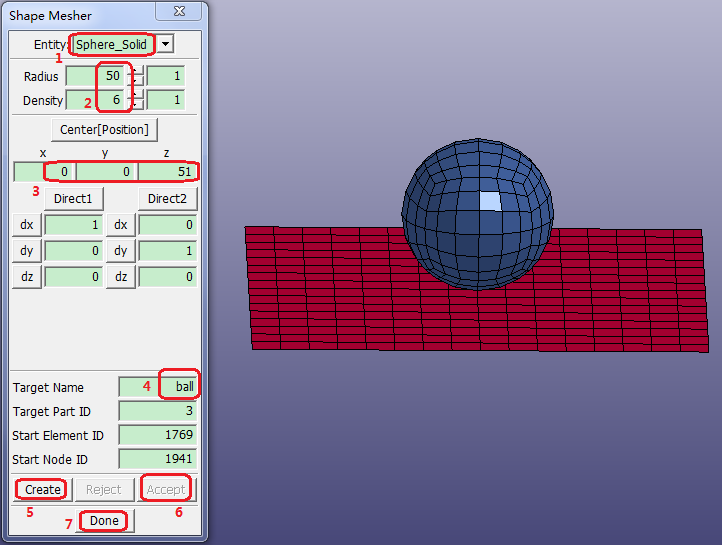Contents Part III: Model Tutorials | Chapter 1: Create an LS-DYNA Input Deck for a Ball Impacting a Plate | Print page 1.2. Create the BallSelect Entity: Sphere_Solid.Enter Radius = 50 and enter Density = 6.Enter Center x = 0, enter y = 0, and enter z = 51.Enter Target Name: ball.Click Create.Click Accept.Click Done. « 1.1. Create the Plate 1.3. Define Materials »