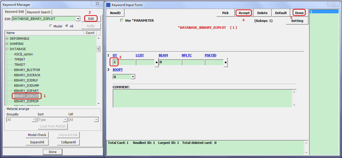 Contents Part III: Model Tutorials | Chapter 1: Create an LS-DYNA Input Deck for a Ball Impacting a Plate | Print page 1.12. Set D3plot FrequencySelect DATABASE > BINARY_D3PLOT from the list.Click Edit.Enter DT = 1 (output complete state every 1ms).Click Accept.Click Done. « 1.11. Set Termination Time 1.13. Set ASCII Time History Outputs »