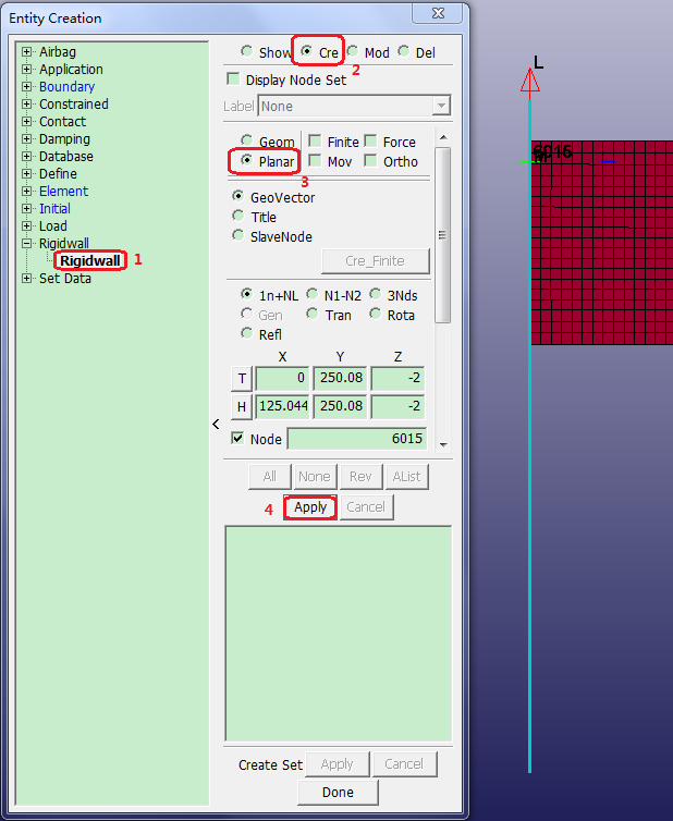 Contents Part III: Model Tutorials | Chapter 3: Create an LS-DYNA Input Deck for an S-Rail Impacting a Rigidwall | Print page 3.9. Create Planar RigidwallSelect Rigidwall.Select Create.Select Planar.Select any node from left end of tube in graphics window.Click Apply. « 3.8. Apply Initial Velocity 3.10. Create Welds Using Master Weld File »
