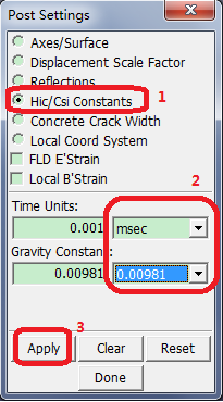 Contents Part IV: Post Tutorials | Chapter 1: Calculate Ooccupant Injury Criterion | Print page 1.2. Specify Unit System SettingsClick Main menu > Settings > Post Settings.Select Hic/Csi Constants.Select Time Units: msec.Select Gravity Constant: 0.00981.Note: These are the appropriate selections for a kg-mm-ms unit system.Click Apply.Click File > Save > Save Config (to save these settings to the .lspostrc configuration file for future use). « 1.1. Open Crash Model Results 1.3. Generate HIC Plot »